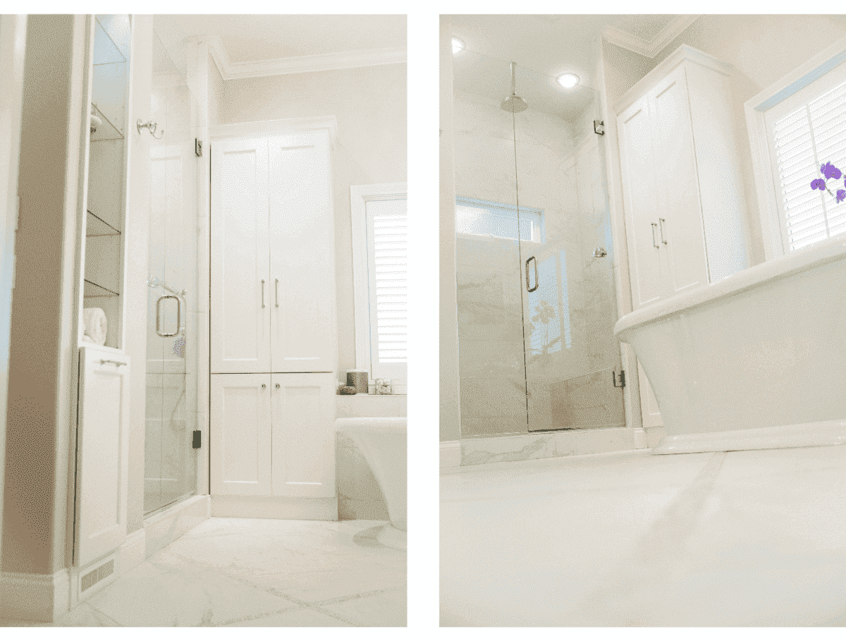 The linen storage for fresh towels and supplies is tucked neatly between the tub and shower, again ensuring that an emergency item is within reach when it is most needed. The space, once opened, is truly cavernous, ensuring that only curated items need to reside on the counter.